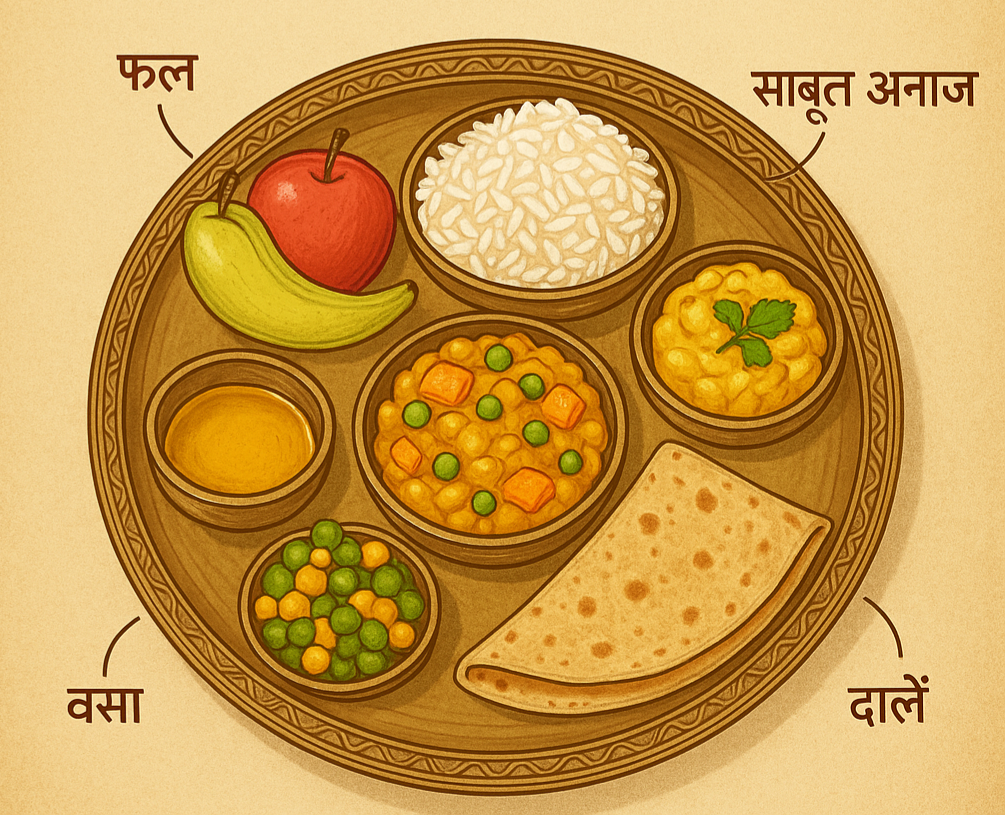 🥦 आहार क्या है? आहार केवल पेट भरने का माध्यम नहीं, बल्कि शरीर को पोषण देने वाला ईंधन है। इसमें पाँच मूल तत्व होने चाहिए:
